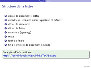 PDF LATEX2e: Un manuel environnement letter: ecrire des lettres postales. Cette page contient des liens vers diff´erentes versions de ce document, dans diff´erents formats et langues, mais aussi vers ses LATEX est un vaste ensemble de commandes qui sont ex´ecut´e par un programme TEX (voir Chapitre 2 [Overview]...