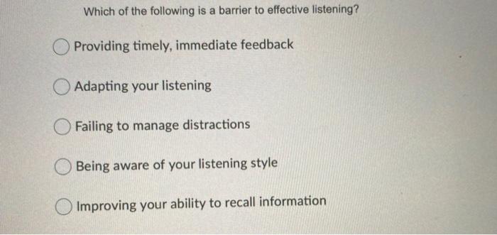 PDF BARRIERS TO EFFECTIVE COMMUNICATION and MANAGING ... - ntgc involves overcoming these barriers and conveying a clear and concise message. Some common barriers to effective communication include: 1. The use of jargon. Over-complicated or unfamiliar terms. 2. Emotional barriers and taboos. 3. Lack of attention, interest, distractions, or irrelevance to the receiver. 4. Differences in perception and ... Chapter 1 Flashcards - Quizlet Raul is attending a workshop, but he is having difficulty hearing the speaker because the people behind him are talking. What type of barrier to effective listening is Raul experiencing? a. Nonverbal distraction b. Grandstanding c. Psychological barrier d. Physical barrier