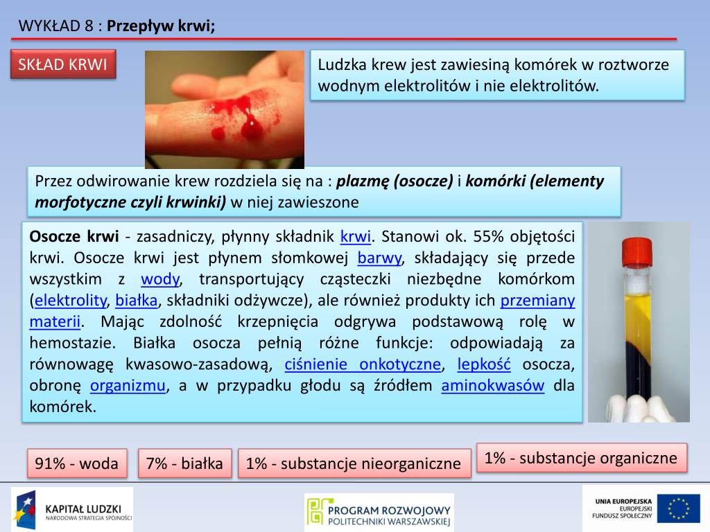 Krew - skład, funkcja, choroby - WP abcZdrowie Skład krwi Krew to płynna tkanka, która krąży po naszym organizmie. W skład krwi wlicza się osocze, krwinki białe, krwinki czerwone oraz płytki krwi. Osocze stanowi około 60 % składu krwi.